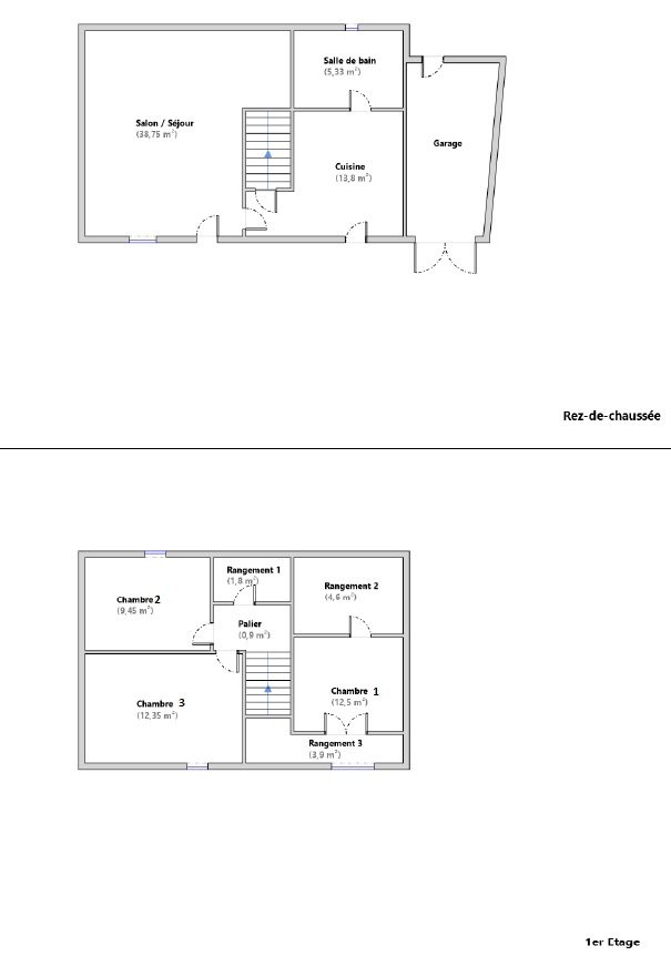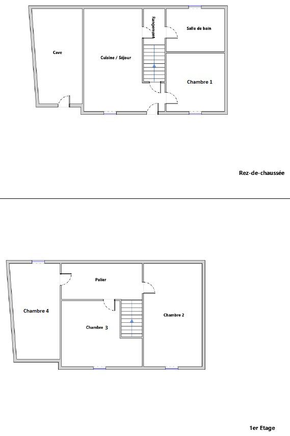 La première maison d’environ 103 m², mitoyenne d’un côté comprend au rez-de-chaussée un séjour avec cantou, une cuisine et une salle d’eau avec WC.