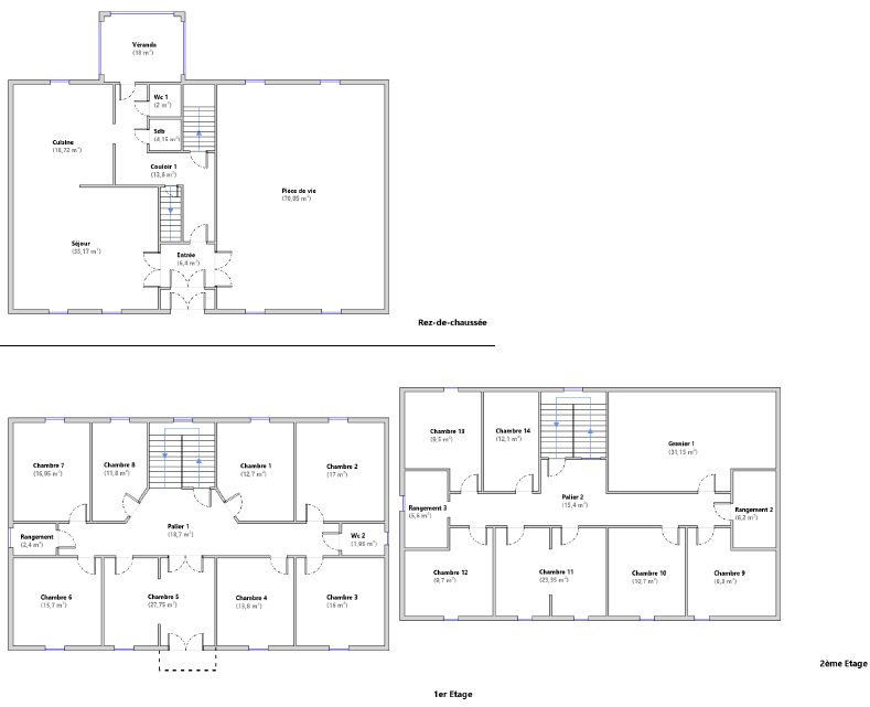 Au premier étage, un palier distribue 8 chambres, une pièce et un WC.
