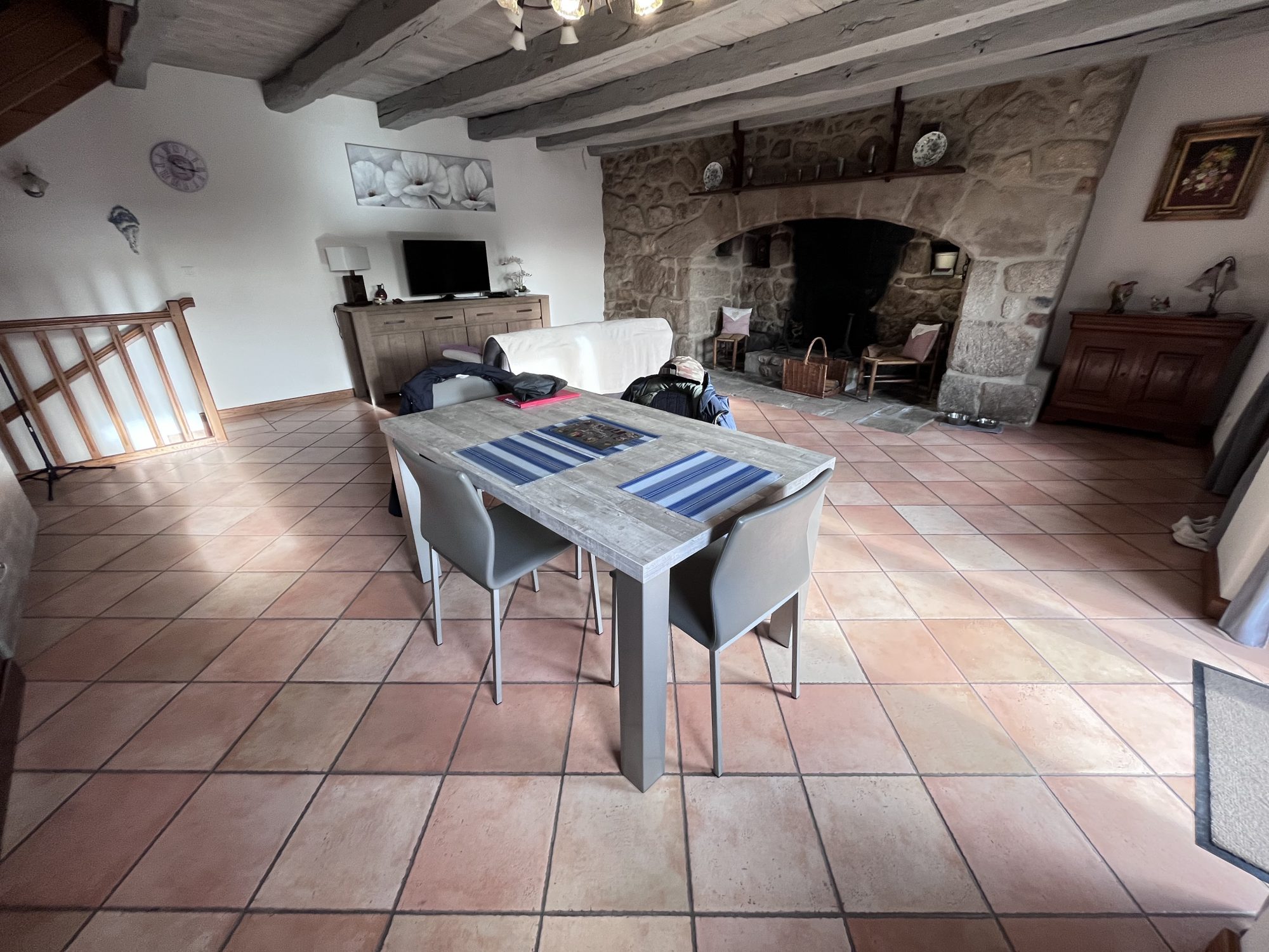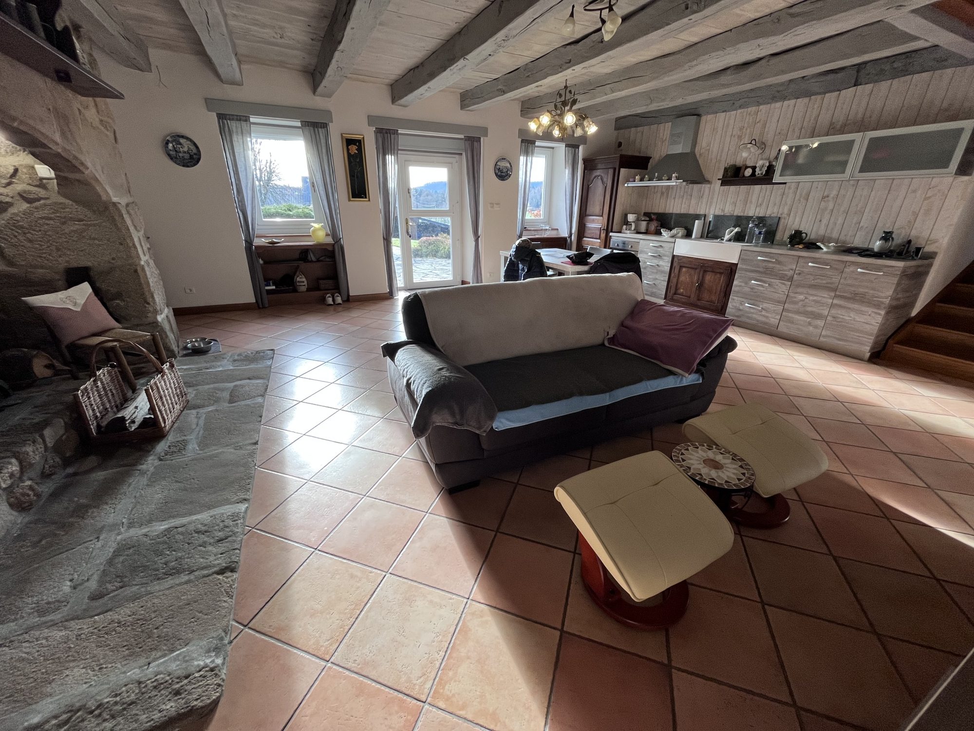 Au rez-de-chaussée, elle offre un séjour lumineux avec une cuisine aménagée et équipée, agrémenté d’un cantou traditionnel avec foyer fermé à bois, complété par un chauffage au sol pour un confort optimal.